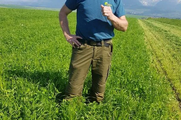 Ján Cvaniga pri kontrole porastu ďatelinovo-trávnej miešanky 9.6. 2021.